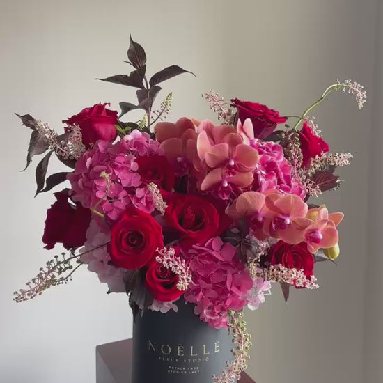 Rich, romantic and luxurious, this deep red-pink bloom box is designed to make a lasting impression. Dramatic yet graceful, Crimson Allure is a true expression of modern floral luxury.