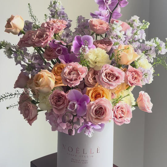 Soft, uplifting, and full of charm, Pastel Harmony is a cheerful bloom box designed to brighten any space. The pastel palette blends gentle blush, peach and lilac tones for a look that feels joyful and refined.